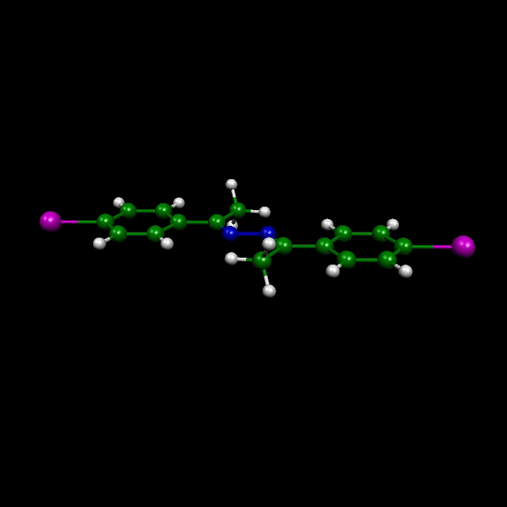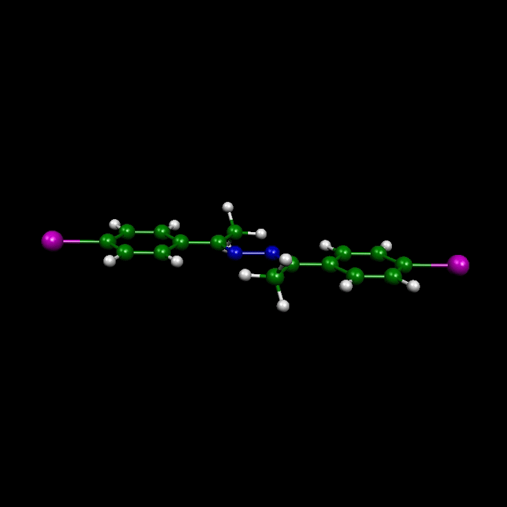 Figure 1. The crystal structure of 4-Iodoacetophenone-(4-methoxyphenylethylidene) hydrazone, the (MeO, I)-azine 7, features perfect dipole-parallel alignment within 2-d layers and near-perfect dipole-parallel alignment in the direction in which the layers are stacked. The directionality of the halogen bonding might control the stacking of the layers.