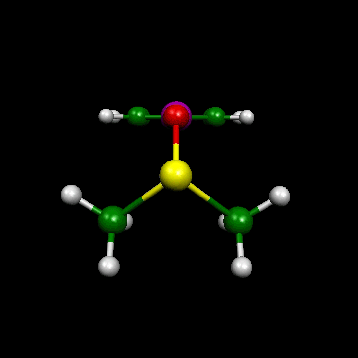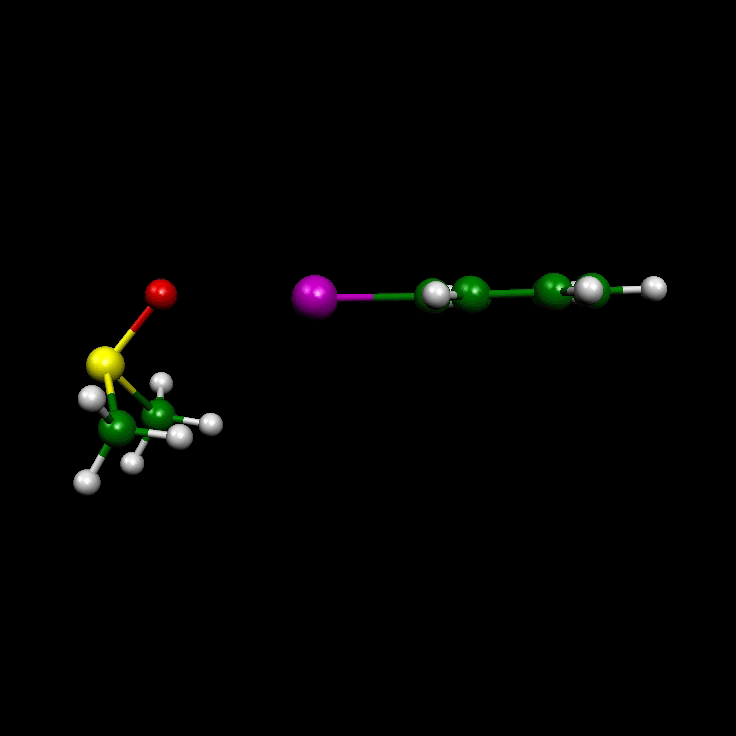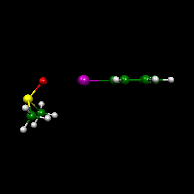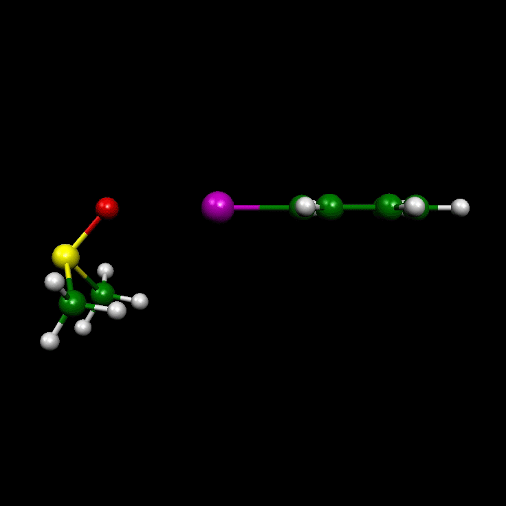 Figure 3. Structures of the iodine bonding complexes between DMSO and 4-iodoacetophenone imine 9 (B3LYP, MP2)), 4-iodoacetophenone hydrazone 10 (B3LYP, MP2), 4-iodoacetophenone 11 (B3LYP, MP2), and 4-iodobenzene 12 (B3LYP, MP2). The online version of this paper contains web-enhanced objects that allow for the 3D-display of the DMSO complex of 12 and of its six lowest vibrations with frequencies 7 cm-1 (torsion mode of the (S-O...Cipso-Cortho) dihedral angle L), 20 cm-1 (rotational mode about the S-O bond), 22 cm-1 (S-O...I angle bending W), 48 cm-1 (O...I-Cipso) angle bending G), 52 cm-1 (S-O...I) angle bending in combination with (O...Cipso-Ph) bending), and 106 cm-1 (d(O...I) stretching mode).