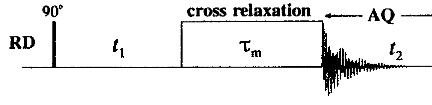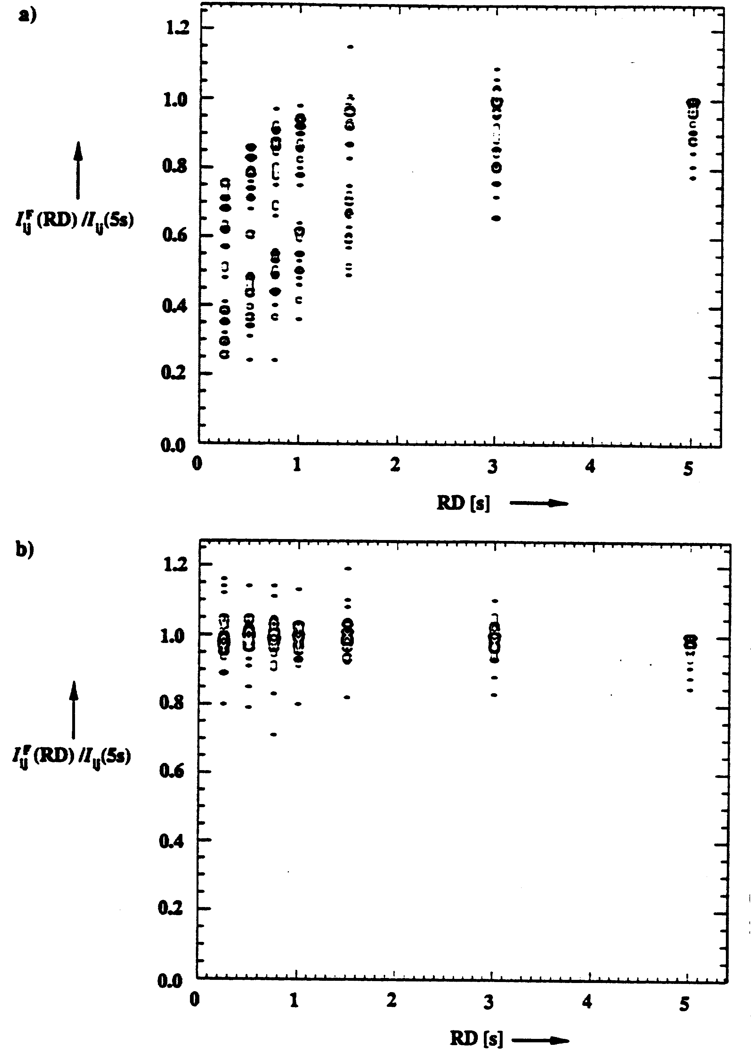 In order to determine the structure of complicated molecules it is useful to obtain H,H coupling data, especially interproton distances between nearby protons. NOESY experiments allows one to obtain this data, however data collection times are necessarily long. In order to obtain good data in the past, a pause between scans equal to two or three times the longest longitudinal relaxation time (=T1=the time it takes protons to relax back to thermal equilibrium) in the molecule was required. Although many NMR procedures require a relaxation between consecutive evolution times, there is the FAST NOESY procedure in which consecutive excitation occur before complete equilibrium of the protons has occurred. FAST NOESY does not take as long as NOESY, but the integrals of these spectra are too small due to the fact that the T1 values are longer than the sum of the relaxation delay and acquisition time in the pulse sequence (see Figure A and B below). The ratio of a cross-peak FAST NOESY integral to the integral cross peak NOESY integral is less than unity [I(RD)/I(5s) < 1]. Kock and Griesinger have discovered a mathematical way to compensate for the weak peaks of a FAST NOESY. They derived their equation for the Liouville-von-Neuman equation, which provides exact correction of NOESY spectra, including spin diffusion effects.2