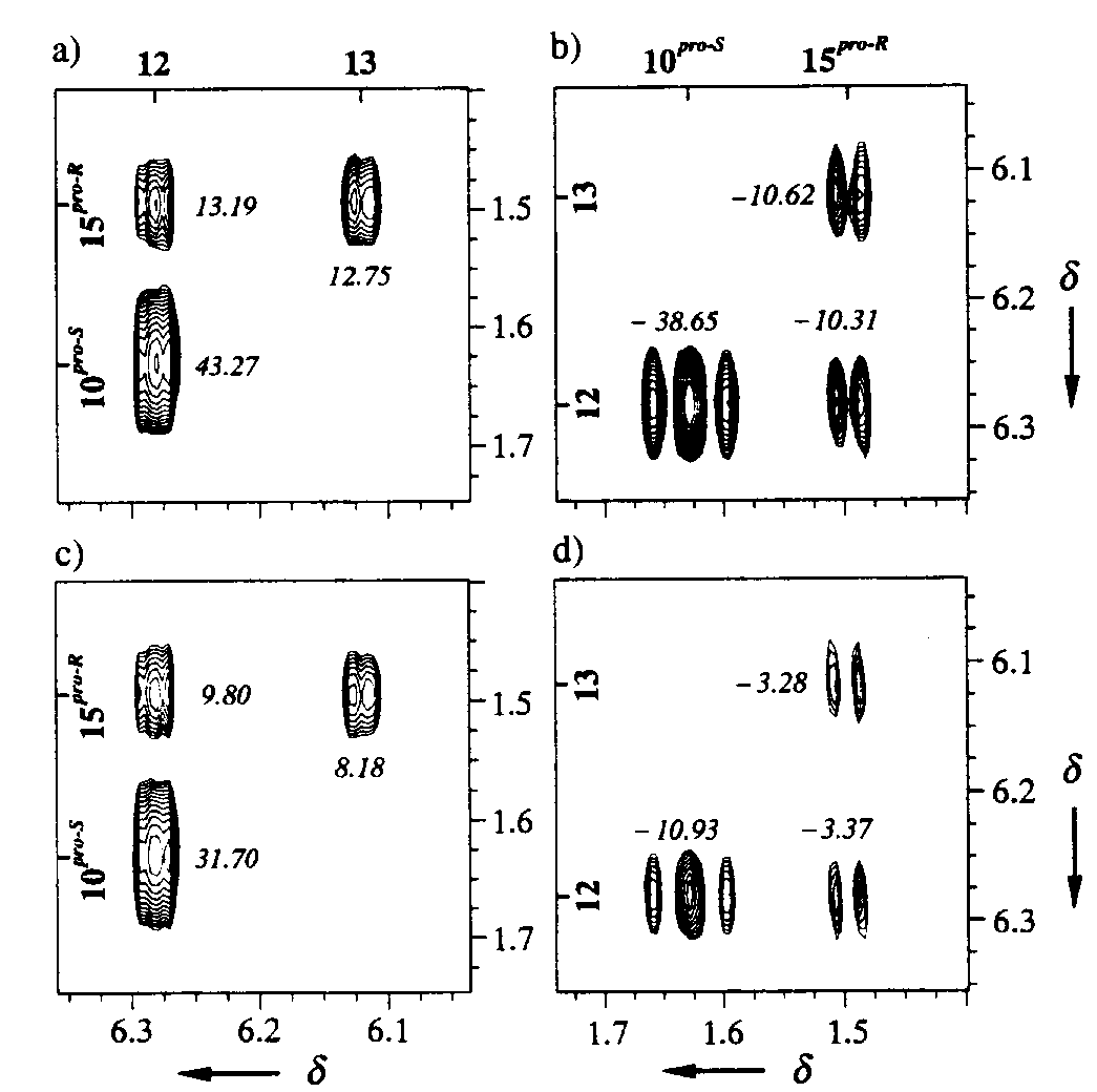 Figure B1 The two plots at the top are NOESY spectra of the compound shown in Fig. C below (where RD = 5 sec). The two plots at the bottom are FAST NOESY spectra of compound C (where RD = 0.25 sec). [NOESY between protons 10 proS, 15 proR, 12 and 13 are shown]